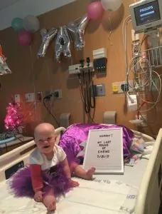 This is when Annie learned how to hunker down and become diligent about providing a germ-free environment. Because of the way chemotherapy works, children in treatment often have compromised immune systems. Despite all precautions, it is very hard to keep children completely protected. Chloe missed several doses of chemotherapy because she was sick or had low white blood cell counts, and at her last scan they learned that her tumor had grown again.